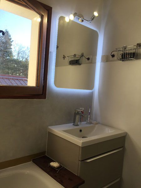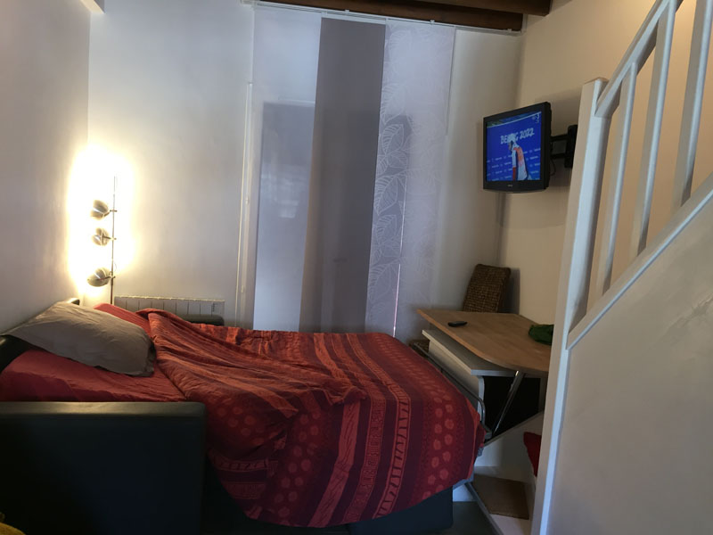 Inside this 2-room duplex apartment in Andon, Thorenc, you’ll find a modern, functional, and cozy space bathed in natural light. The duplex features two TVs, a queen-size bed (160×190 cm) upstairs with three adjustable positions—perfect for stargazing or watching TV—and a convertible sofa downstairs for extra guests. The bedroom, partially under the eaves, offers stunning views of the pine trees and mountains, with removable interior shutters to control the light.